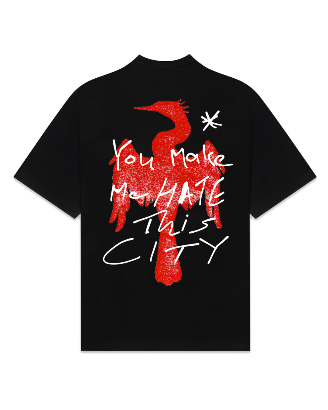 A raw declaration of urban discontent. The Hate This City tee features a stark red bird graphic, overlaid with defiant, handwritten text: "You Make Me HATE This City." Unfiltered emotion, undeniable style.