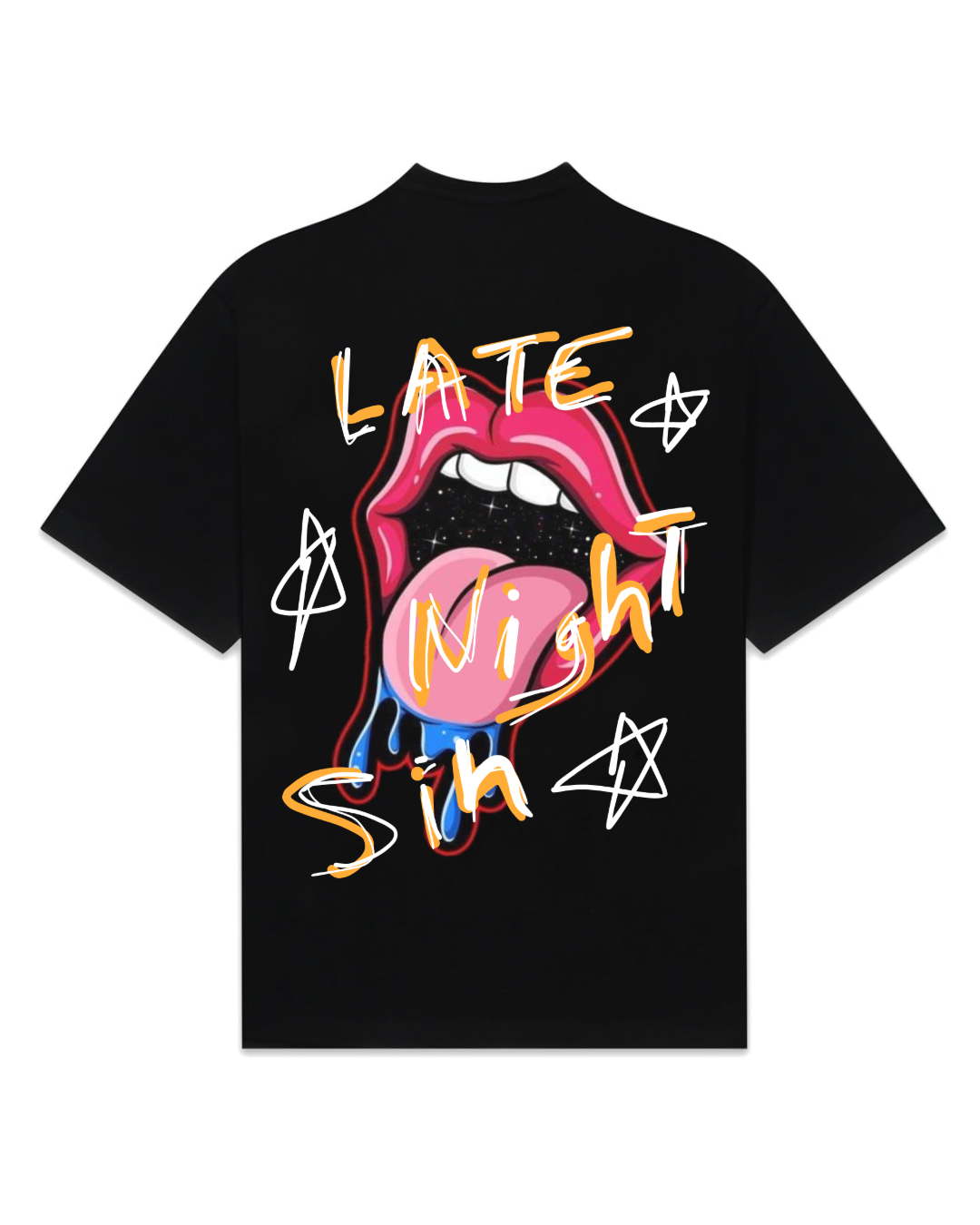 Temptation is the only rule. The Late Night Sin tee features a vivid back graphic of a dripping mouth holding a starry galaxy, overlaid with sharp, handwritten text. The taste of forbidden freedom.